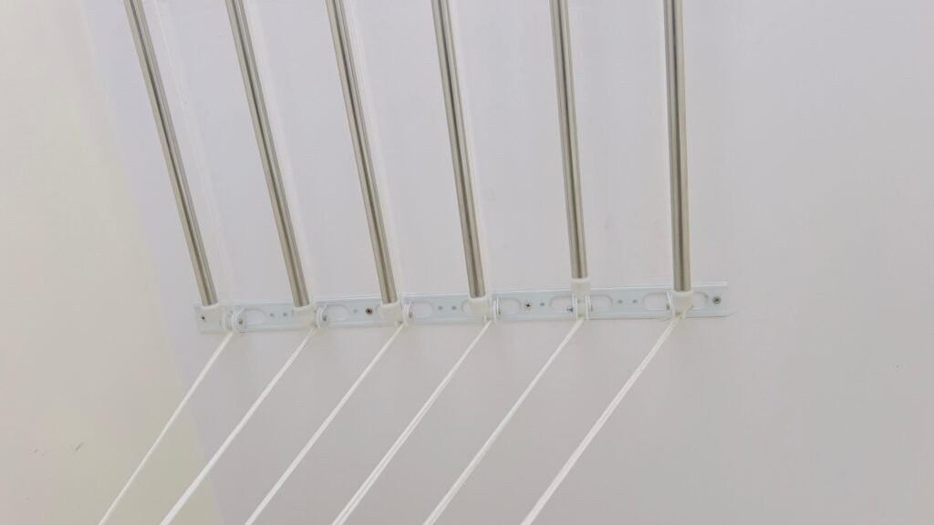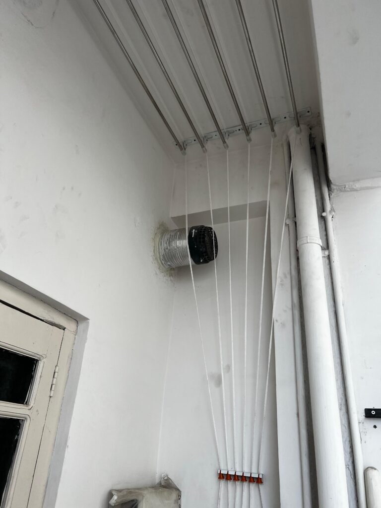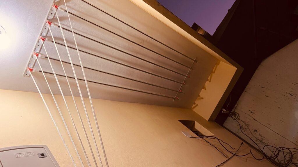 Professional installation of ceiling-mounted drying hangers with strong pulleys and rust-free stainless steel rods.